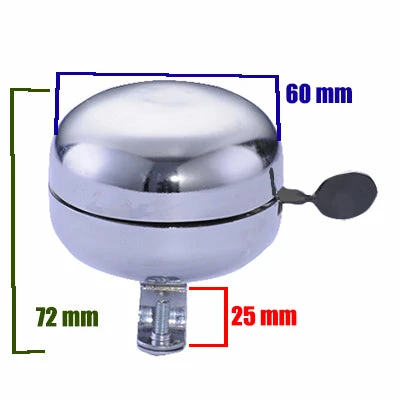 La sonnette vélo chrome possède un son puissant qui s’active par un bouton poussoir. D’un diamètre de 60 mm pour une hauteur de 72 mm, elle se fixe facilement sur un guidon d’un diamètre de 25 mm maximum. La fixation et les vis sont fournies.