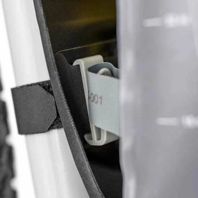 Une fois installée dans la sacoche, la poche à eau se connecte au clip accessoire présent dans les sacoches bikepacking de la marque (photo 4). Sa grande ouverture permet un remplissage facile sans avoir à sortir la poche de la sacoche. Pour une étanchéité parfaite, la fermeture hermétique est doublée d’une fermeture par enroulement à scratch.